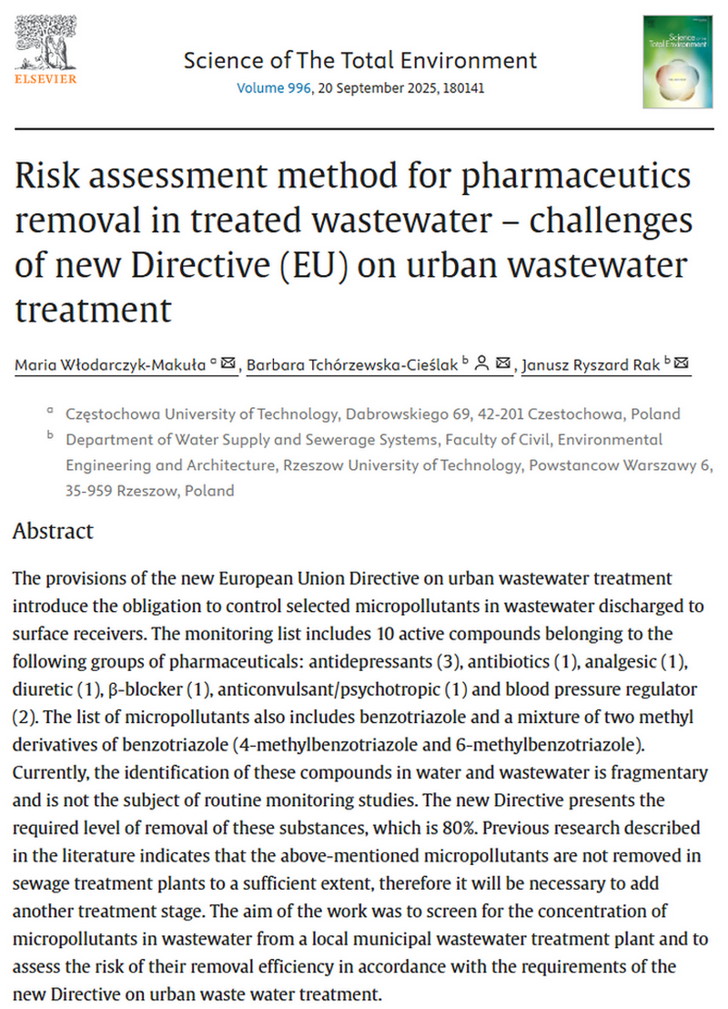 Zapraszamy do lektury nowego artykułu w czasopiśmie Science of The Total Environment pt. Risk assessment method for pharmaceutics removal in treated wastewater – challenges of new Directive (EU) on urban wastewater treatment, który powstał we współpracy prof. dr hab. inż. Barbary Tchórzewskiej – Cieślak oraz prof. dr hab. inż. Janusza Raka z prof. dr hab. inż. Marią Włodarczyk-Makułą z Politechniki Częstochowskiej.
